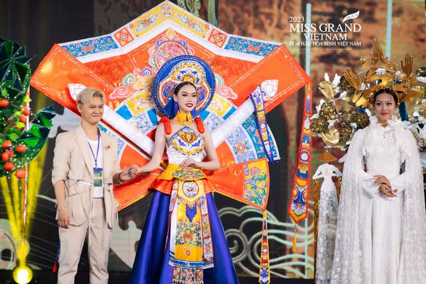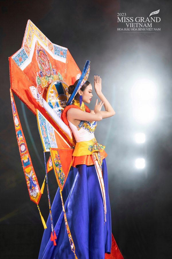 Thân trên của bộ trang phục là sự kết hợp đầy sáng tạo của phom áo dài và áo yếm. Tà áo, mấn được đính kết tỉ mỉ bằng đá bắt sáng. Điểm nhấn của thiết kế là bộ cánh cao 1,35m mô tả hình ảnh nghi môn trước điện Thái Hòa (Đại Nội Huế). Phần cánh dựng 3D như một chiếc quạt đang xòe mang ý nghĩa về sự sung túc, thịnh vượng. NTK Nguyễn Việt Hưng đã đưa màu sắc và họa tiết trang trí đặc trưng của Pháp lam Huế lên trang phục một cách đầy sống động. Anh mong muốn kể câu chuyện lịch sử dân tộc, lưu giữ vẻ đẹp của văn hóa, kiến trúc và thẩm mỹ cung đình Huế qua lăng kính thời trang.
