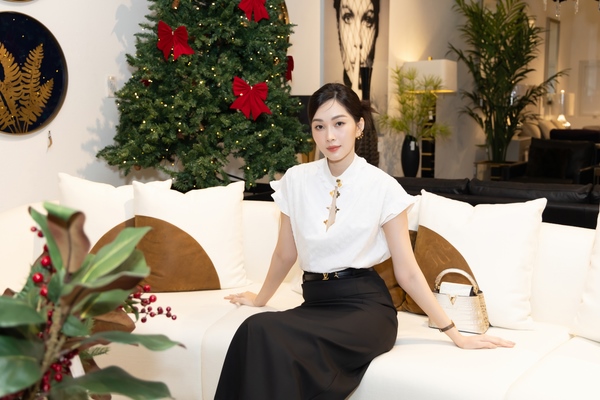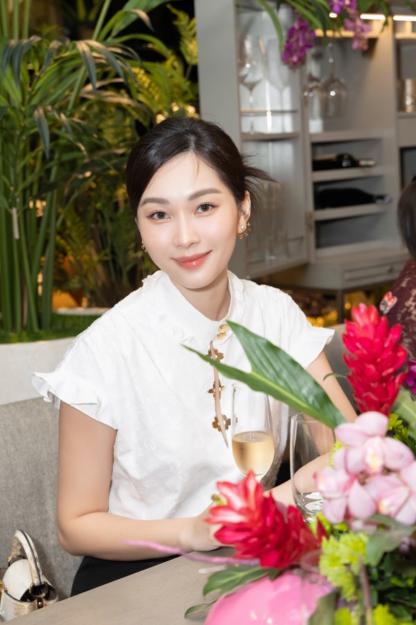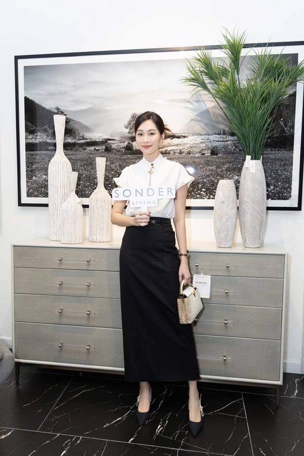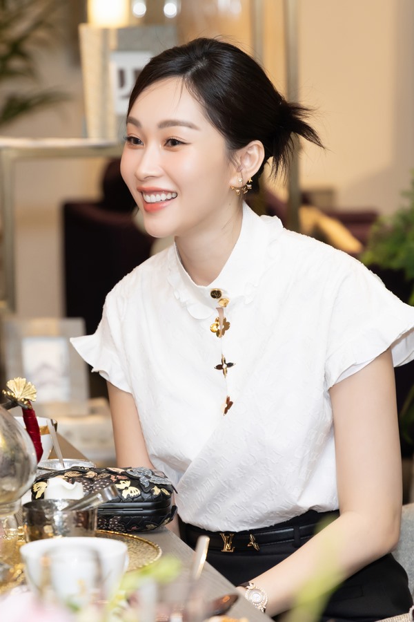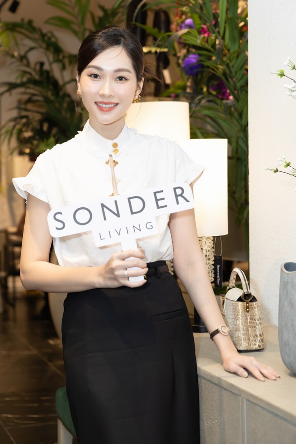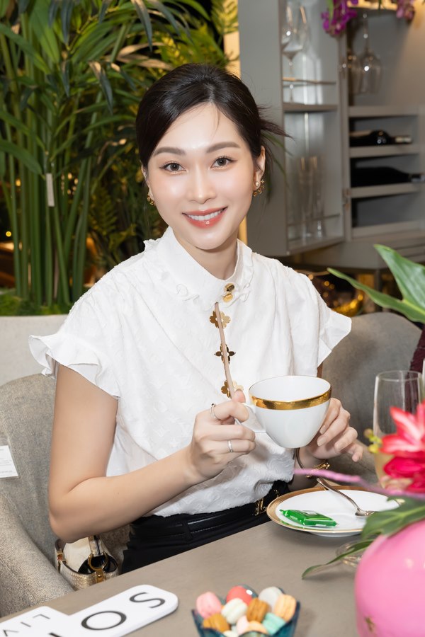 Là một trong những nhan sắc thường xuyên dành những lời hoa mỹ để khen ngợi, tham dự tiệc trà của Sonder Living Vietnam, người đẹp lựa chọn trang phục đơn giản nhưng vẫn nổi bật nhờ thần thái “beauty queen”. Nàng hậu diện một chiếc áo thun ba lỗ trắng đi cùng quần baggy lưng cao, khoe sắc vóc trẻ trung, năng động.