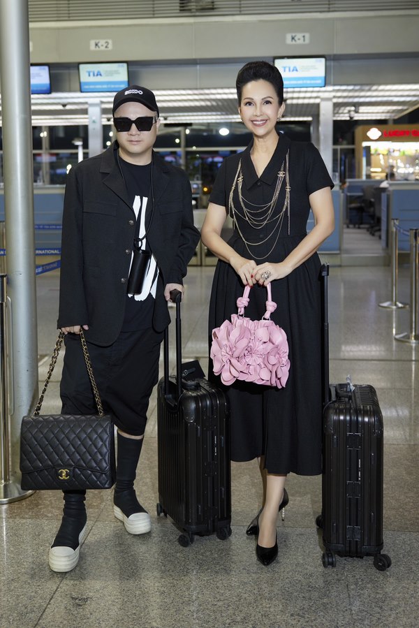 Đồng hành với NTK Đỗ Mạnh Cường trong chuyến đi này là diễn viên Diễm My. Chị gắn bó với anh trong hơn chục năm qua, sở hữu hàng ngàn trang phục của Đỗ Mạnh Cường, SIXDO. Diễn viên Diễm My diện đầm đen, mang phong cách cổ điển thanh lịch, mang vòng cổ Chanel.