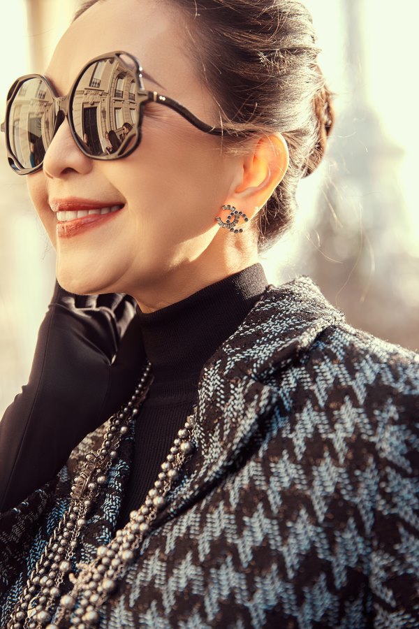 Diễm My mang vòng cổ, đeo hoa tai Chanel. Nữ diễn viên mang kính to bản của Linda Farrow, cách điệu ở phần gọng kính trông mềm mại, cuốn hút. Túi đen tối giản của Fendi kết hợp ăn khớp với trang phục. Tổng thể phối nhiều phụ kiện nhưng tạo thành từng tầng, lớp, không rối mắt.