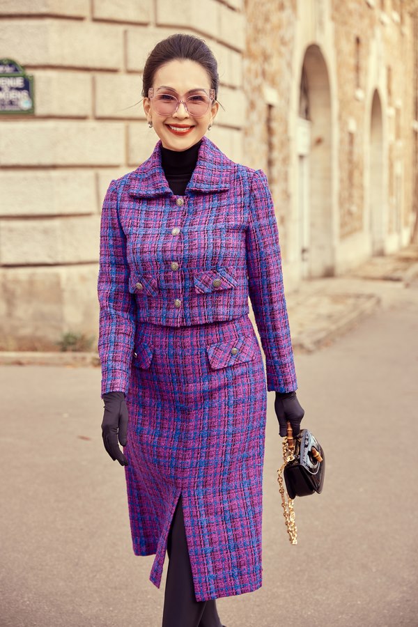 Diễm My nổi bật trên phố với trang phục màu tím, được kết hợp nhiều sắc độ tạo hiệu ứng thị giác, tạo điểm nhấn bằng túi to bản đối xứng. Chị khéo léo phối cùng mắt kính tím nhạt, đồng màu trang phục. Với bộ cánh này, Diễm My phối cùng túi dây kim loại mạ vàng ánh kim của Gucci.