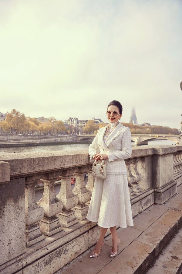 Bộ cánh bằng vải tweed màu trắng đậm chất nữ tính khi phối giữa áo vest cùng chân váy chữ A xoè nhẹ. Diễm My mang kính Linda Farrow, đeo hoa tai, vòng cổ ánh kim của Chanel. Chị cũng sưu tập thêm chiếc túi Dior size mini vào BST túi. Đây là mẫu túi nằm trong BST Xuân Hè 2023 của thương hiệu này. Bộ cánh được chị diện khi đến cầu Alexandre III (tên tiếng pháp là Pont Alexandre III). Đây cũng là một trong những điểm đến nổi tiếng hàng đầu tại Paris, có lịch sử hơn 120 năm.
