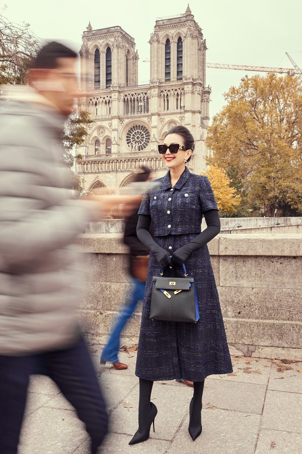 Bộ trang phục màu xanh đen được diễn viên Diễm My diện đến Nhà thờ Đức Bà Paris. Thiết kế có tông màu lạnh nhưng cũng rất nổi bật trên đường phố nhờ những chi tiết ánh nhũ đen được phối hài hoà, vừa tạo điểm nhấn, vừa tạo hoạ tiết cho nền vải. Với bộ trang phục này, Diễm My mang túi màu đen pha xanh của Hermes, đi Pantaboots, mang hoa tai Chanel và kính to bản phong cách cổ điển.