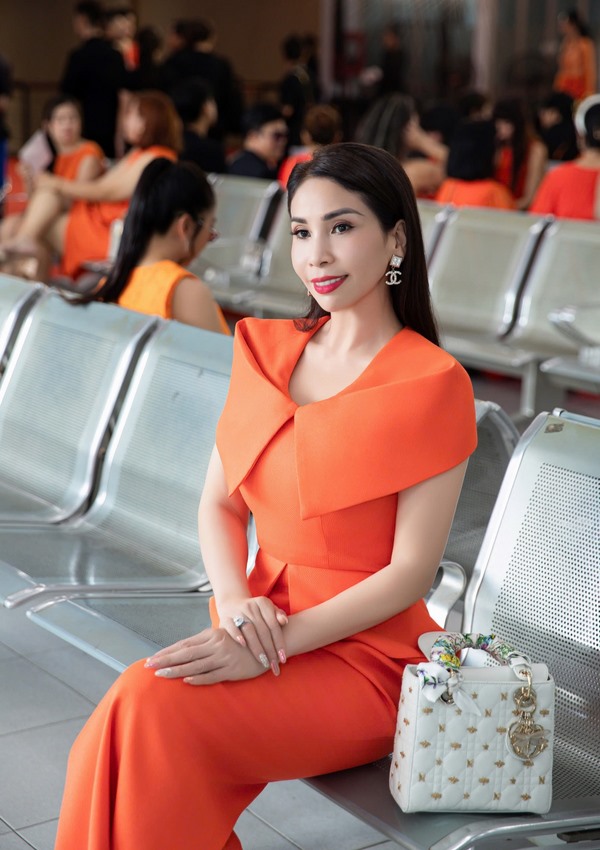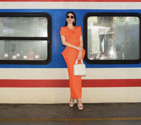 Diễn viên điện ảnh Lý Hương chọn cho mình chiếc đầm màu cam thắt eo và tôn dáng của Vu Ngoc & Son kết hợp cùng phụ kiện và túi xách trang nhã để khoe khéo vóc dáng khỏe khoắn nhờ chăm chỉ luyện tập thể thao kết hợp với chế độ ăn và lối sống lành mạnh. Cô cho biết: “Mặc dù sinh ra và lớn lên tại mảnh đất Sài Gòn nhưng đây là lần đầu tiên Lý Hương có cơ hội đặt chân đến Ga Sài Gòn. Cảm xúc khi đặt chân đến đây nó lạ lắm và càng thú vị hơn khi được thả mình trong không gian thời trang được thiết kế bên cạnh đường tàu. Mọi thứ thật đẹp, đáng nhớ và rất bất ngờ”.