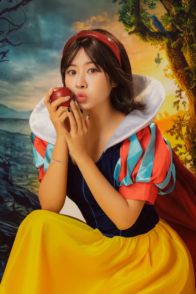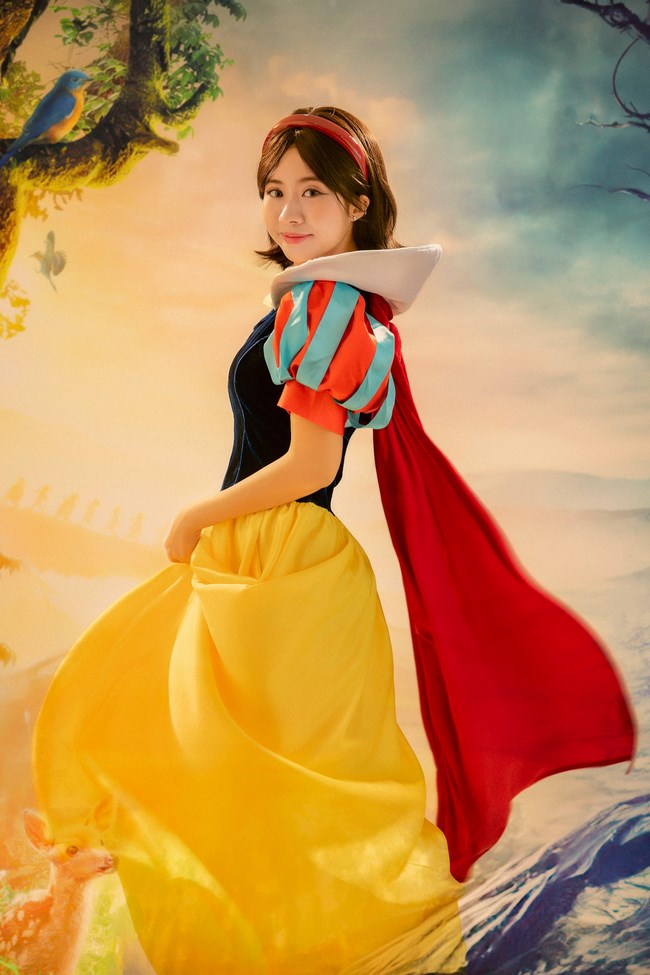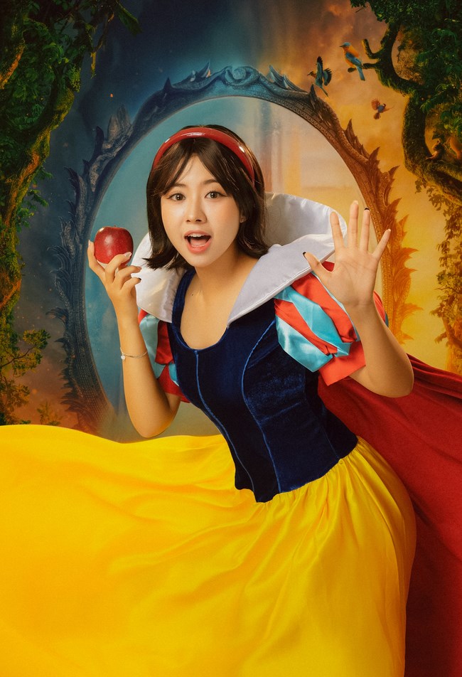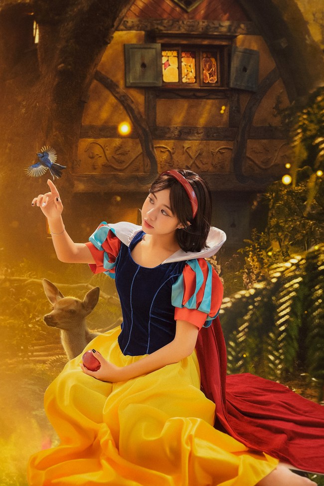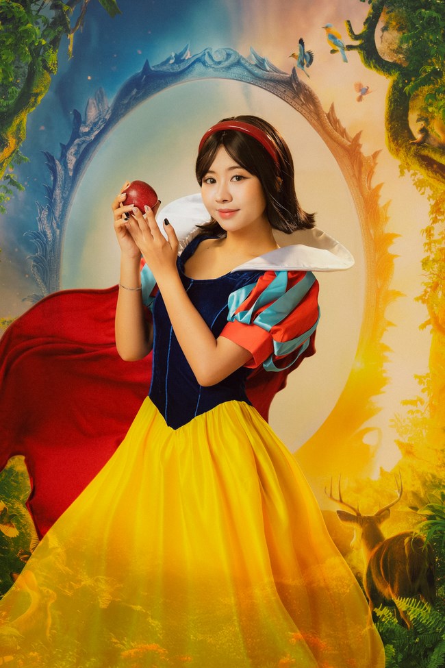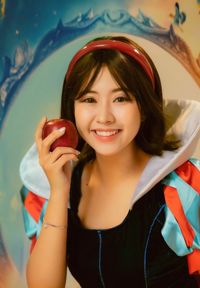 Với kiểu tóc ngắn đặc trưng của nàng công chúa đình đám nhà Chuột, chiếc váy tone xanh và phụ kiện nơ đỏ cùng nhan sắc trong veo, ngọt ngào, Đỗ Lê Hồng Nhung đã hóa thân thành Bạch Tuyết đầy lộng lẫy, xinh đẹp, mang hơi thở hiện đại nhưng vẫn giữ trọn tinh thần nguyên bản. Dễ dàng nhận thấy trong từng khung hình, không gian cổ tích được tái hiện sống động, kết hợp giữa ánh sáng ấm áp và tạo hình tỉ mỉ, giúp tôn vinh vẻ đẹp ngây thơ, thuần khiết của nàng Bạch Tuyết.