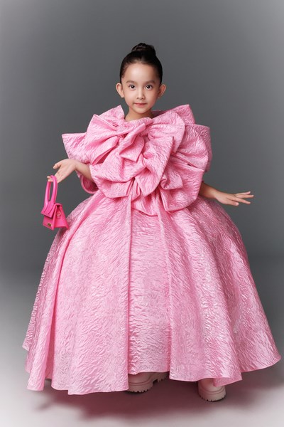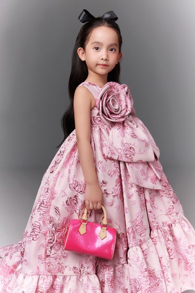 Cô bé 5 tuổi diện đầm dáng rộng bằng chất liệu vải gấm kết hợp cùng chiếc túi của Louis Vuitton. Bản gốc của thiết kế từng được Đỗ Mạnh Cường giới thiệu tại Tuần lễ Thời trang Thượng Hải Xuân – Hè 2025.