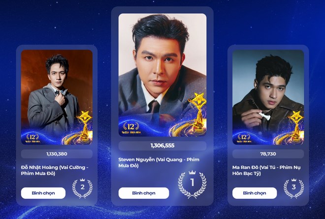 Ở lĩnh vực Điện ảnh, cuộc cạnh tranh ghi nhận sự áp đảo về lượt bình chọn của một số gương mặt quen thuộc. Steven Nguyễn (vai Quang – phim Mưa Đỏ) hiện đang tạm dẫn đầu hạng mục Nam diễn viên được yêu thích nhất với 1.301.955 lượt bình chọn, tạo khoảng cách đáng kể so với các vị trí còn lại. Theo sát phía sau là Đỗ Nhật Hoàng (vai Cường – phim Mưa Đỏ) với 1.127.015 lượt bình chọn, trong khi Ma Ran Đô (vai Tú – phim Nụ Hôn Bạc Tỷ) đang giữ vị trí thứ ba với 78.730 lượt bình chọn. Bảng Nữ diễn viên được yêu thích nhất tiếp tục là Phương Mỹ Chi dẫn đầu với 1.992.520 lượt bình chọn, theo sát vị trí 2 và 3 lần lượt là Đoàn Thiên Ân cùng Lê Hạ Anh.