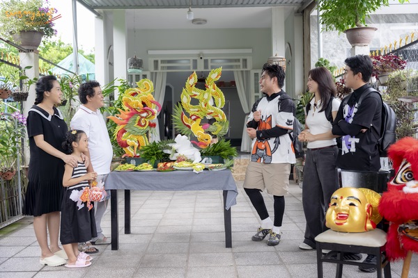 Lần theo dấu vết được gợi ý, ba nghệ sĩ tìm đến nhà của gia đình anh Thuận – nghệ nhân điêu khắc tráp cưới rồng phượng. Như anh Thuận chia sẻ đây là nghề truyền thống của gia đình, anh được cha ông truyền lại. Với những công trình trang trí lớn, anh Thuận có một câu lạc bộ quy tụ nhiều nghệ nhân cùng nhau thực hiện liên tục trong nhiều ngày đêm để hoàn thành dự án. Những nguyên liệu khô có thể được sử dụng để trang trí trước, nguyên liệu cần giữ độ tươi xanh thì khoảng 2-3 ngày trước khi hoàn thành mới bắt đầu thực hiện. Phương Anh Đào phụ giúp vợ chồng anh Thuận hoàn thành tráp cưới trong khi anh em Dương Lâm – Cris Phan vào bếp để chuẩn bị bữa sáng cho cả nhà.