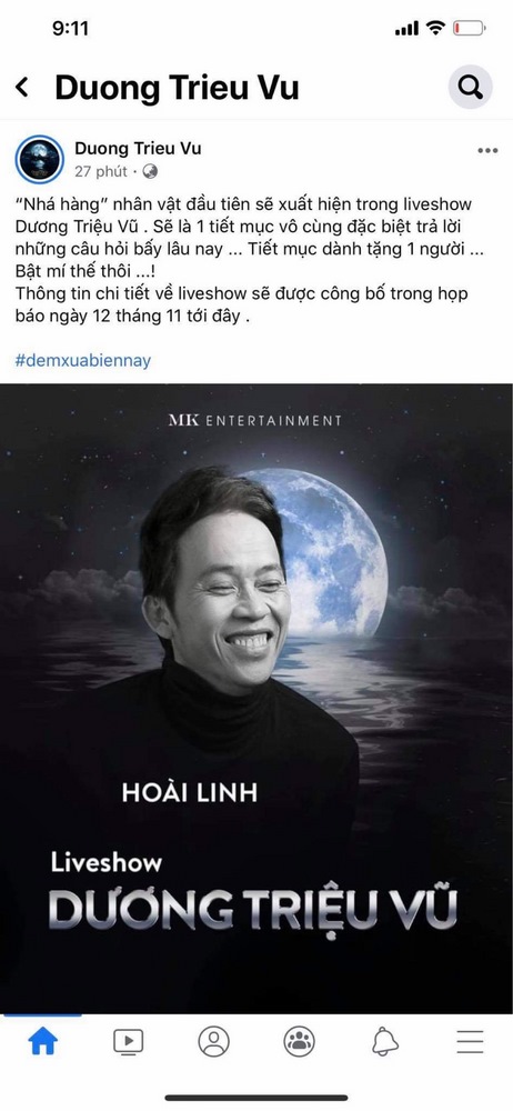 Mới đây, trên trang cá nhân của mình, Dương Triệu Vũ bất ngờ “nhá hàng” nhân vật đầu tiên xuất hiện trong liveshow sắp tới của mình chính là Danh hài Hoài Linh. Anh nói thêm, đây sẽ là một tiết mục vô cùng đặc biệt trả lời những câu hỏi bấy lâu nay và dành tặng cho một người đặc biệt.