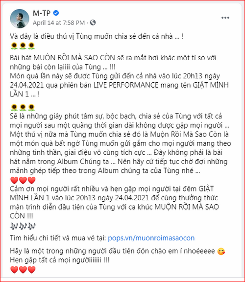 Sau nhiều ngày chờ đợi, cuối cùng những thông tin chính thức về Live Performance Giật Mình Lần 1 – Muộn Rồi Mà Sao Còn cũng được Sơn Tùng M-TP hé lộ trên trang cá nhân của mình. Theo đó, sự kiện sẽ diễn ra chính thức vào lúc 20h13 ngày 24.04.2021 và được phát độc quyền trên nền tảng website giải trí POPS.vn.