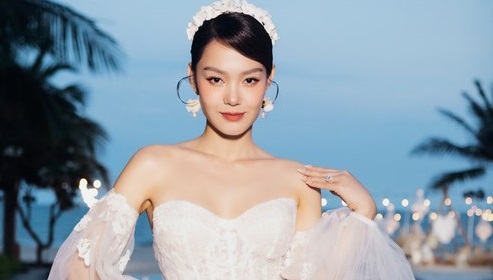Bộ váy trắng tinh khôi với họa tiết thêu 3D đạt độ tinh xảo cao và dáng váy ball gown đã biến Minh Hằng thành nàng công chúa kiều diễm trong hôn lễ. Bên cạnh đó, từng cánh hoa được xếp nếp tỉ mỉ càng tạo cảm giác mềm mại và bay bổng như những tầng mây. Chiếc váy cưới cúp ngực thuộc bộ sưu tập mùa Xuân 2020 của Marchesa Couture trị giá đến 16.000 USD (hơn 371 triệu đồng) còn tôn lên bờ vai gợi cảm và phong thái sang chảnh của nữ ca sĩ kiêm diễn viên.
