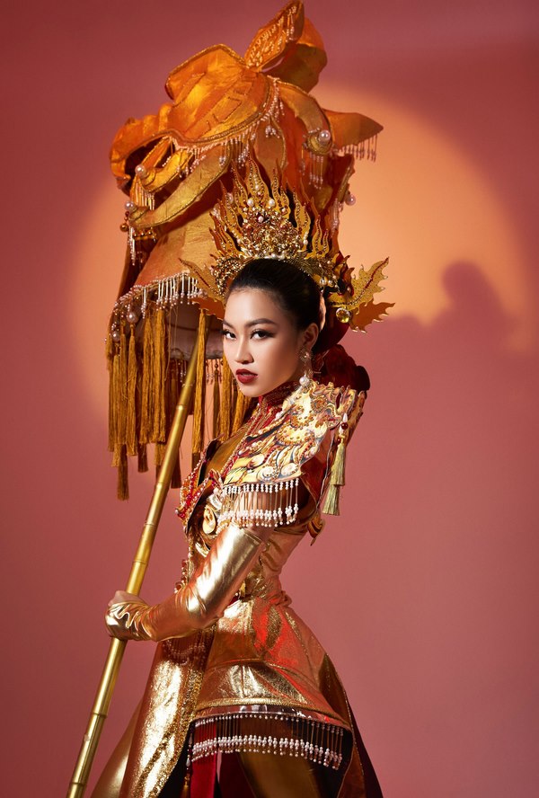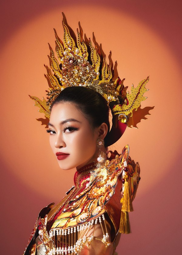 Bên cạnh bộ trang phục chính, theo NTK Nguyễn Việt Hưng, chiếc mấn được cách điệu bởi hình ảnh phượng chầu mặt trời, hoa sen thể hiện quyền lực, khí chất của phụ nữ Việt. Quyền trượng với đầu Nghê được làm bằng tre và giấy bồi là sự gặp gỡ của yếu tố truyền thống và hiện đại, vừa thân thuộc lại tạo nên sự giao thoa độc đáo cho thiết kế.