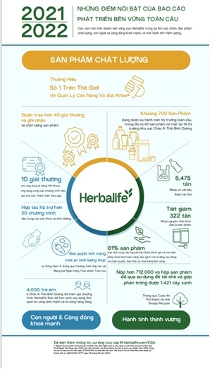 Báo cáo Phát triển Bền vững Toàn cầu 2021-2022 của Herbalife nêu bật những thành tựu của công ty trong ba lĩnh vực chính, bao gồm: