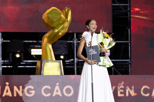 Hoa hậu H’Hen Niê được vinh danh với hạng mục “Đại sứ Quảng cáo truyền cảm hứng” nhờ những đóng góp tích cực trong hoạt động sáng tạo nghệ thuật và cống hiến cho cộng đồng. Cô chạy show từ địa điểm cách đó 500m và “chạy bộ” để kịp giờ lên nhận thưởng.