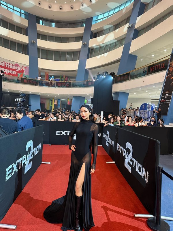 Sau đó, đoàn tham gia sự kiện Red Carpet và công chiếu phim Extraction 2. Hoa hậu H’Hen Niê xuất hiện nổi bật với bộ cánh màu đen của NTK Quý Cao, khéo khoe đôi chân cùng vóc dáng chuẩn của mình. Cô sử dụng phụ kiện khăn trùm đầu, kiêu sa trên thảm đỏ và nhanh chóng thu hút sự chú ý của khán giả.