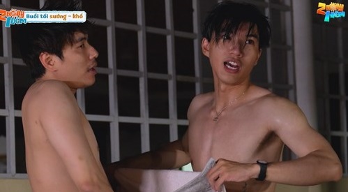 Đây cũng là lần đầu tiên hieuthuhai phải tắm lộ thiên cùng 2 đàn anh và có máy quay theo sát ghi hình nên anh chàng không tránh khỏi bẽn lẽn ngượng ngùng. Khi ‘cực phẩm 6 múi’ lộ diện, 2 người anh đặc biệt là Trường Giang đã không ngừng ‘á ố’ trước cơ bụng của cậu út. Tuy sở hữu thân hình không chút mỡ thừa nhưng hieuthuhai vẫn phải nhờ tới sự trợ giúp của Kiều Minh Tuấn để thay đồ.