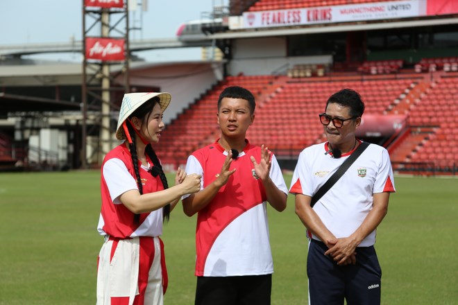 Ngay khi đặt chân đến “xứ sở chùa Vàng”, các cầu thủ nhí đã có cơ hội đến thăm SVĐ Quốc gia Rajamangala (Bangkok) – một trong những biểu tượng thể thao lớn nhất Thái Lan, đồng thời là địa điểm sẽ diễn ra SEA Games 33 vào tháng 12/2025. Với sức chứa hơn 50.000 khán giả, Rajamangala không chỉ là “thánh địa” của bóng đá Thái Lan mà còn là nơi chứng kiến nhiều khoảnh khắc thể thao đáng nhớ của khu vực.