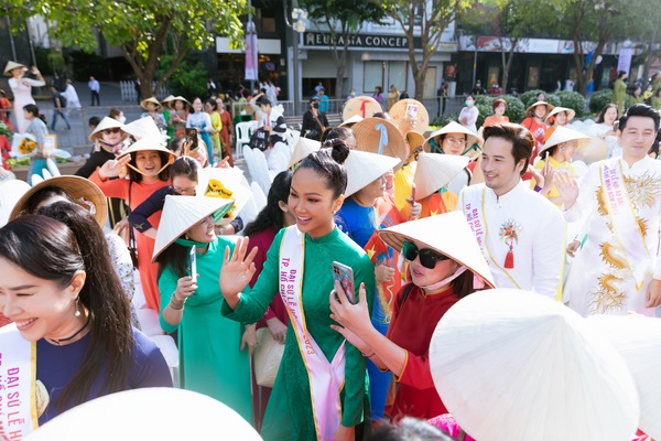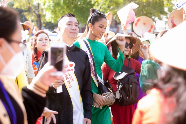 Có mặt tại nơi diễn ra hoạt động từ rất sớm, Hoa hậu H’Hen Niê cho biết cô rất hào hứng được đi diễu hành áo dài cùng mọi người, vì vậy ngày hôm trước sau khi xong công việc, cô tranh thủ đi ngủ sớm để hôm nay có thật nhiều năng lượng vui cùng đoàn diễu hành. Người đẹp rạng rỡ nắm tay các đại sứ khác, cùng nhau hát vang những bài hát ca ngợi phụ nữ và thành phố.