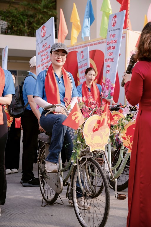 “Buổi sáng hôm nay thật sự rất tưng bừng và tràn đầy năng lượng khi được cùng Ủy ban Mặt trận Tổ quốc Việt Nam phường Hòa Hưng đạp xe vận động bầu cử qua các tuyến đường Cách Mạng Tháng 8 và 3 Tháng 2. Không khí rất sôi nổi, mọi người đều hào hứng tham gia và lan tỏa tinh thần tích cực,” cô chia sẻ.