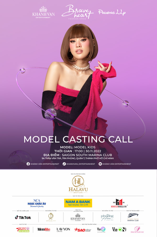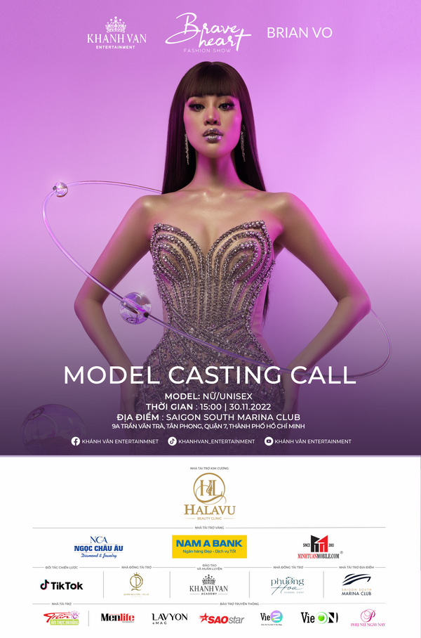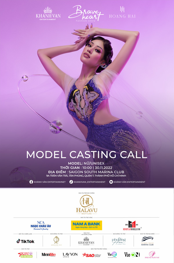 Buổi Model Casting Call “Brave Heart Fashion Show 2022” được tổ chức ngày 30/11/2022 từ 10 giờ, tại Saigon South Marina Club (SSMC), quận 07. Các người mẫu trẻ có thể đến ghi danh đăng ký và tìm kiếm cơ hội trình diễn cho 04 bộ sưu tập đến từ NTK Hoàng Hải, NTK Phương Hồ (mẫu nhí), NTK Đặng Trọng Minh Châu, NTK Brian Võ. Lịch trình và thông tin chi tiết buổi Casting Call được cập nhật trên fanpage Khánh Vân Entertainment.