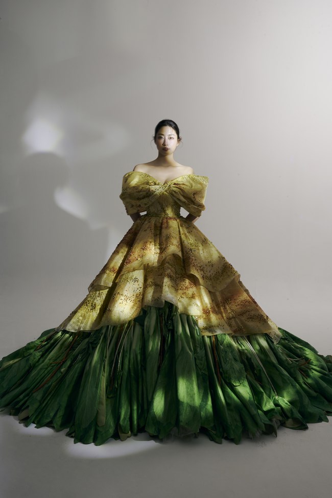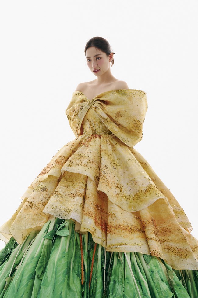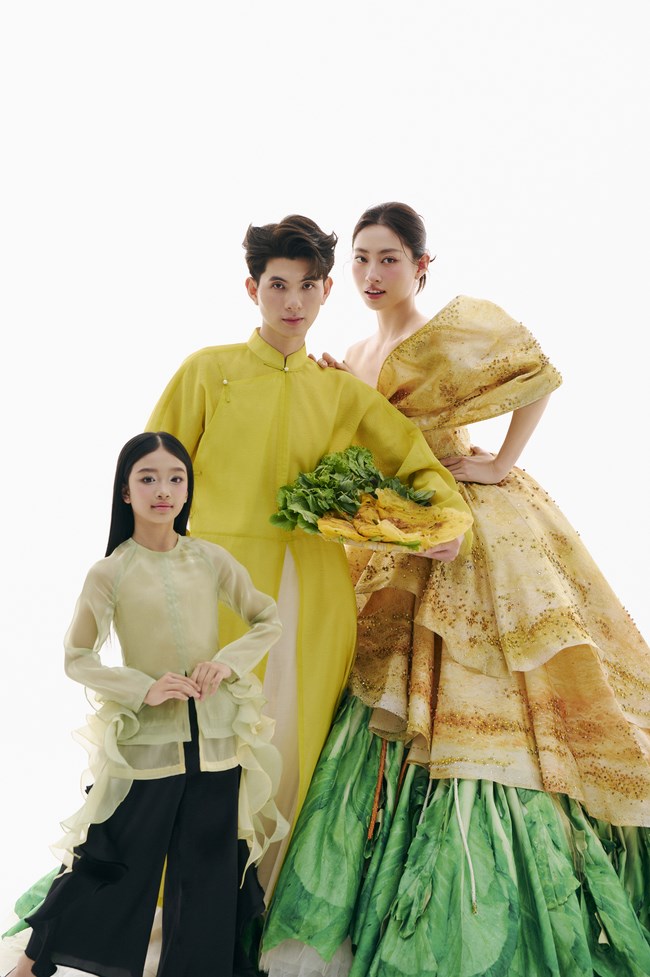“Bên cạnh những chất liệu truyền thống, tôi sử dụng một số chất liệu phi thời trang như giấm lên men từ dừa. Nguyên liệu này để khô cũng tạo thành màu sắc giống với một số loại bánh. Ngoài ra còn có thân và lá chuối khô bện lại thành dây, khi kết hợp các chất liệu này lên trang phục cũng ra được màu sắc mang tính thời trang cao cấp và ứng dụng thực tiễn.” – Nguyễn Minh Công tiết lộ. Những sáng tạo này không chỉ làm thỏa mãn thị giác mà còn khơi dậy ký ức, tình cảm quê hương trong lòng người xem.