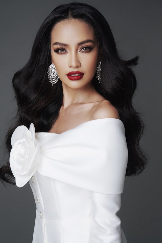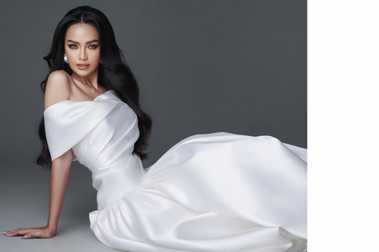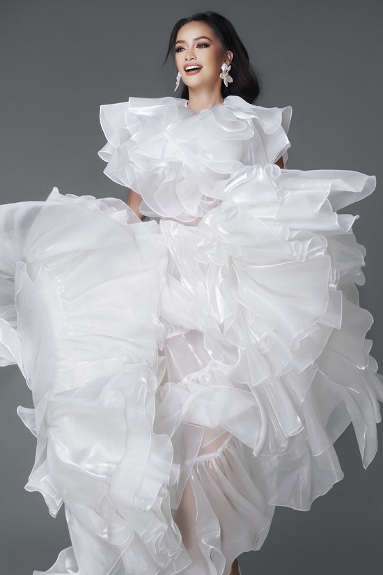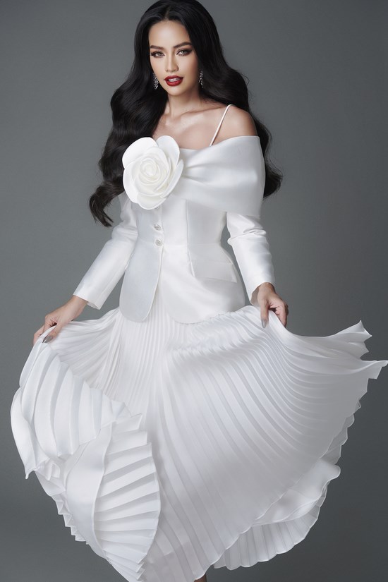 NTK chú trọng vào việc tạo phom độc đáo cho trang phục. Chiếc váy trắng tạo điểm nhấn bởi những đường gấp nếp bất đối xứng. Phần thân váy được hạ dài xuống hơn thắt eo tạo điểm nhấn.