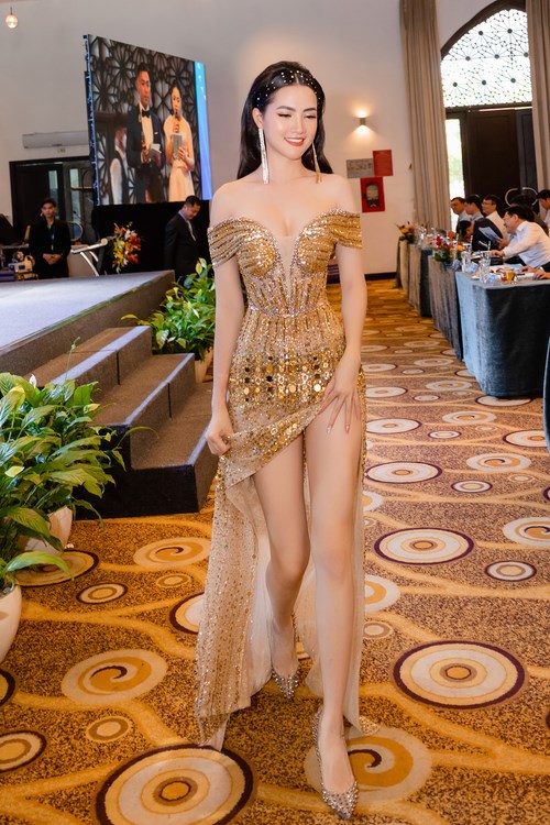 Hoa hậu Phan Thị Mơ xuất hiện rạng rỡ với váy dạ hội đính đá sang trọng, kiêu sa như một nữ thần tại một sự kiện.