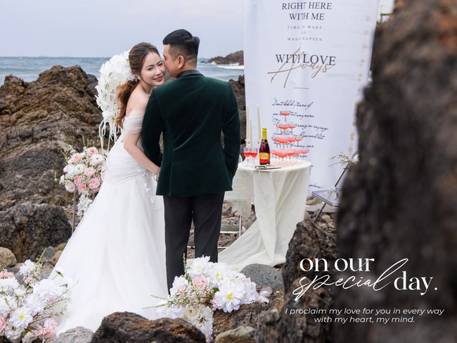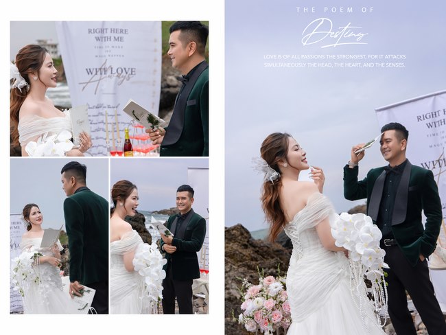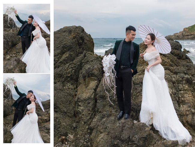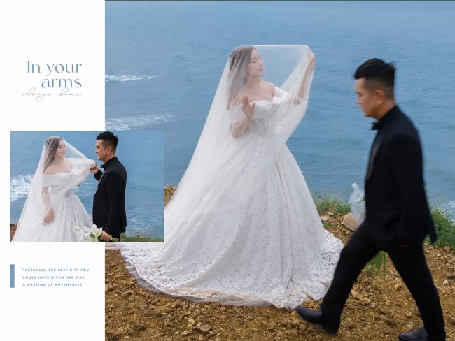 Tại Hồ Cốc, điểm đến nổi bật của Vũng Tàu, cặp đôi lựa chọn khung cảnh biển trời khoáng đạt làm phông nền cho những bức ảnh đầy thi vị. Thanh Tâm xuất hiện duyên dáng trong hai mẫu váy cưới trắng chủ đạo một chiếc đầm bồng xòe mang phong cách công chúa nhẹ nhàng, một chiếc đầm đuôi cá tinh tế tôn dáng. Cả hai thiết kế đều khai thác chất liệu bay bổng và chi tiết ren mềm mại, gợi lên hình ảnh một cô dâu dịu dàng mà vẫn hiện đại. Đồng hành bên cạnh, Hùng Thuận diện vest lịch lãm, tạo nên một tổng thể hài hòa, sang trọng.