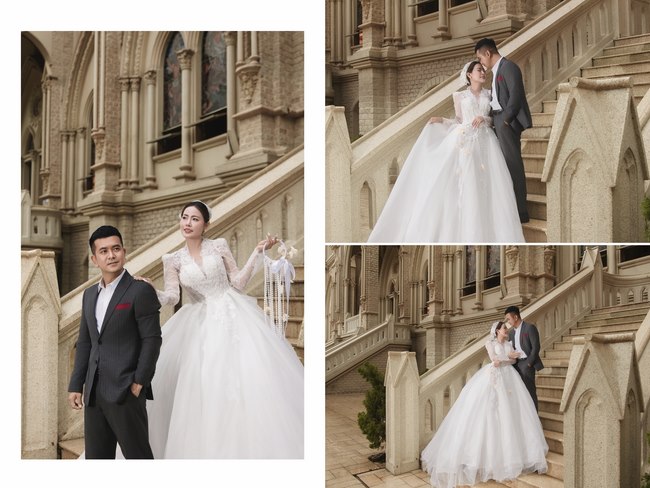 Không chỉ dừng lại ở biển trời Hồ Cốc, cặp đôi còn chọn nhà thờ Song Vĩnh làm điểm dừng chân thứ hai cho bộ ảnh cưới. Tại đây, Thanh Tâm diện bộ váy cưới cổ điển, thanh lịch được xử lý ren thủ công tinh xảo, sánh bước bên Hùng Thuận trong bộ vest tone xám nhã nhặn.