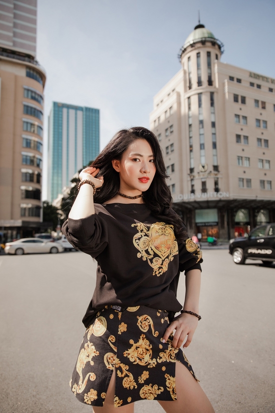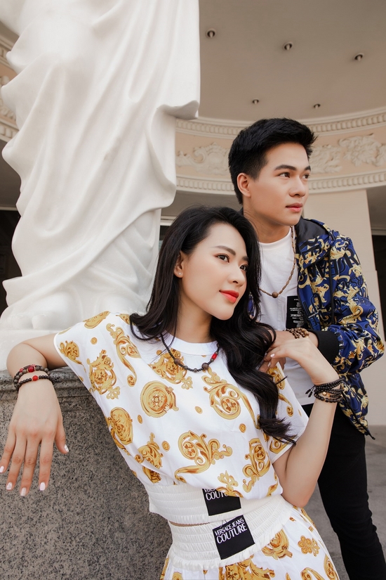 Với phong thái cuốn hút cùng gu thời trang hàng hiệu ấn tượng, cặp đôi Minh Trang, Kha Vũ nhanh chóng hút mắt trở thành tâm điểm khi xuống phố. Trang phục họa tiết sắc vàng rực rỡ và thời thượng đến từ thương hiệu Versace Jeans là một dấu ấn hoàn hảo.