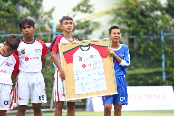 Tại sân bóng, đại diện Tập đoàn LOTTE – ông Ko Soo Chan cũng có mặt để theo dõi trận đấu nảy lửa của 2 đội bóng “Cầu thủ nhí” và đội “Phú Nhuận”. Trước khi trao những phần quà giá trị, ông Ko Soo Chan có chia sẻ: “Tôi xin chân thành cảm ơn 2 HLV đã có thể bồi dưỡng và rèn luyện các cầu thủ nhí được kỹ năng thi đấu rất tốt trong thời gian rất ngắn. Và tôi hy vọng chương trình sẽ giúp các bạn cầu thủ nhí tài năng ở Việt Nam có cơ hội ra nước ngoài huấn luyện. Và đặc biệt các bạn sẽ trở thành cầu thủ nổi tiếng không chỉ ở trong nước”. Ngay sau đó, ông Ko Soo Chan đã trao tặng cho trường THPT Phú Nhuận 50 triệu đồng.