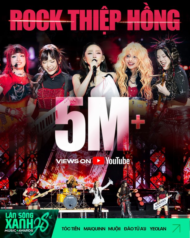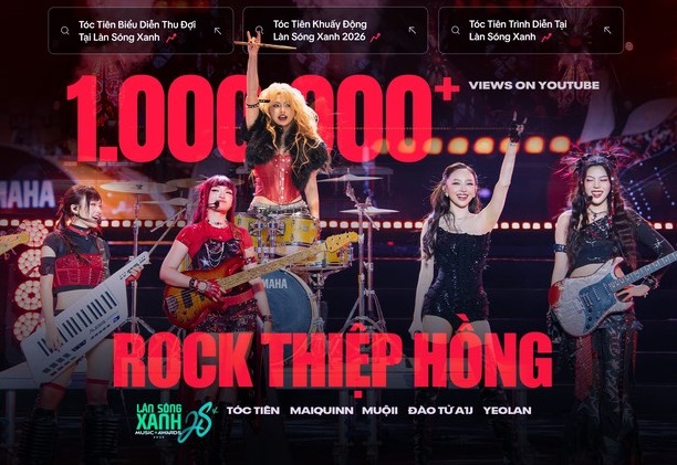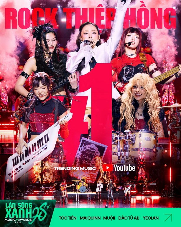 “Sức công phá” của Lễ trao giải Làn Sóng Xanh 2025 được minh chứng rõ nét nhất qua “mặt trận” Youtube với 14 tiết mục đồng loạt đổ bộ vào Top trending. “Cú nổ” lớn nhất phải kể đến Mashup “Rock Thiệp Hồng”, một màn kết hợp “vô tiền khoáng hậu” giữa Tóc Tiên và dàn nghệ sĩ bước ra từ Em Xinh Say Hi (Maiquinn, Đào Tử A1J, Muộii và Yeolan). Tiết mục này không chỉ giữ vững ngôi vương trending tại Việt Nam với hơn 5 triệu lượt xem mà còn vươn tầm quốc tế khi đứng ở vị trí thứ 7 Top trending toàn cầu, đồng thời chiếm giữ thứ hạng cao tại Úc, Canada, Mỹ và Đức.