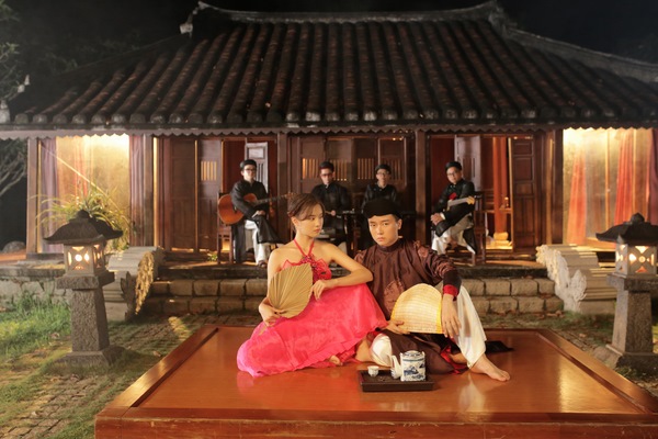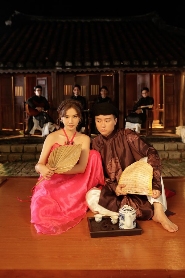 Trong đêm trăng thanh gió mát, hai nghệ sĩ nổi bật trong trang phục truyền thống – Bùi Công Nam diện áo dài còn Hoàng Yến Chibi mặc yếm đỏ vào vai một cặp đôi đang ngồi thưởng trà ngoài sân và trò chuyện cùng nhau.