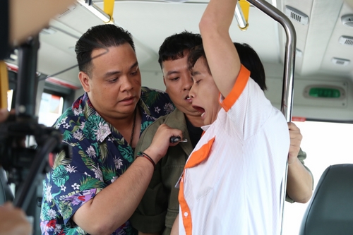 Khải quyết định ôm túi tiền, giằng co với cả đám người luôn. Lúc này bác tài cũng không nhịn được, đã cởi áo lộ diện chân tướng “anh hùng” Hoàng Sơn, xuống xe “lụm” Khải. May sao đội bảo vệ của hãng xe xuất hiện kịp thời.