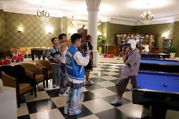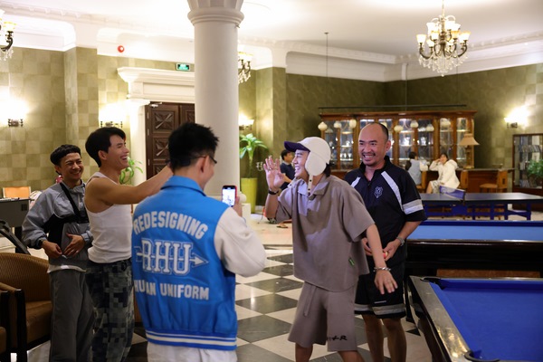 Ở một góc quay khác, Trương Thế Vinh cũng đang nhanh chóng đi mượn đạo cụ từ ekip để chuẩn bị cho clip Nhà Mứt Gừng. Thậm chí, nam ca sĩ còn sắm vai chuyên gia trang điểm, tự mình họa mặt cho Anh Tài Hoàng Hiệp. Khi Phan Đinh