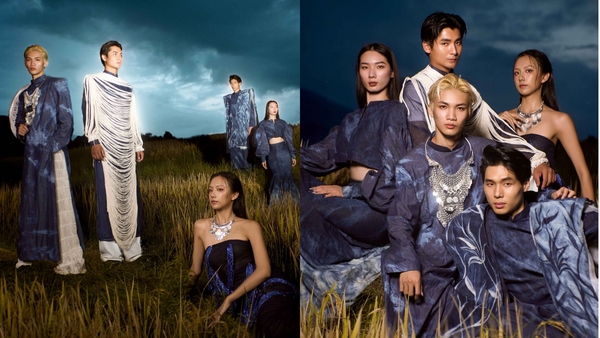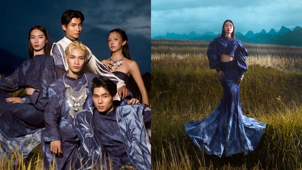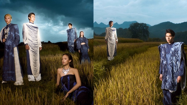 Với nét trầm buồn của màn đêm cùng những ánh sáng còn sót lại của mặt trời, những thiết kế của “Dệt nắng chàm” được trở về đúng với tinh thần của BST với những vệt nắng vàng cuối ngày cùng sắc xanh huyền bí của vải lanh nhuộm chàm. Bốn thiết kế Bùi Hoàng Ân mang đến trong bộ ảnh là những thiết kế nổi bật nhất mang form dáng từ áo dài truyền thống đến váy đuôi cá, váy suông được thực hiện đầy kỳ công từ việc xử lý thủ công chất liệu vải, tốn 300 giờ để đan thắt các sợi dây cho một chi tiết… Qua lookbook, BST “Dệt nắng chàm” được nêu bật lên với sự hòa quyện của phong cảnh ruộng bậc thang và sắc trời Hà Giang.
