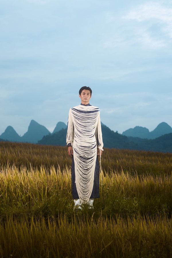 BST “Dệt nắng chàm” được lấy cảm hứng từ màu sắc vải lanh nhuộm chàm thủ công và vẻ đẹp của những họa tiết truyền thống của người dân đồng bào xứ Đông Bắc Hà Giang. NTK Bùi Hoàng Ân đã khéo léo thổi hồn vào những nét đẹp truyền thống bằng những ánh sáng, vệt nắng được thực hiện với chất liệu kỹ thuật mới. Mang phong cách thời trang hiện đại cùng nét đẹp truyền thống đặc trưng của vải lanh nhuộm chàm, Bùi Hoàng Ân mong muốn đứa con tinh thần của mình có thể tôn vinh nét đẹp thời trang cùng cảnh sắc Hà Giang. Vì vậy mà NTK gen Z đã lựa chọn Hà Giang là địa điểm thực hiện lookbook lần này.