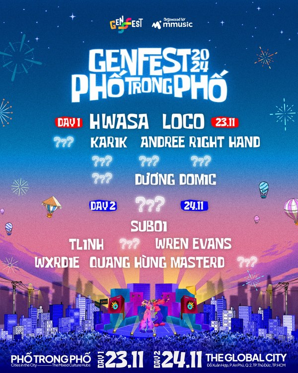Trở lại sau thành công rực rỡ của GENfest 2023 với chủ đề “Cổng Âm Nhạc Đa Giác Quan”, GENfest 2024 được tổ chức bởi MMUSIC với chủ đề Phố Trong Phố sẽ diễn ra trong 2 ngày 23/11 và 24/11 tại Trung tâm mới The Global City (TP. HCM).