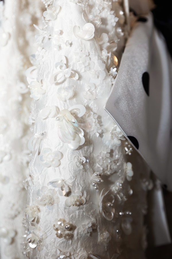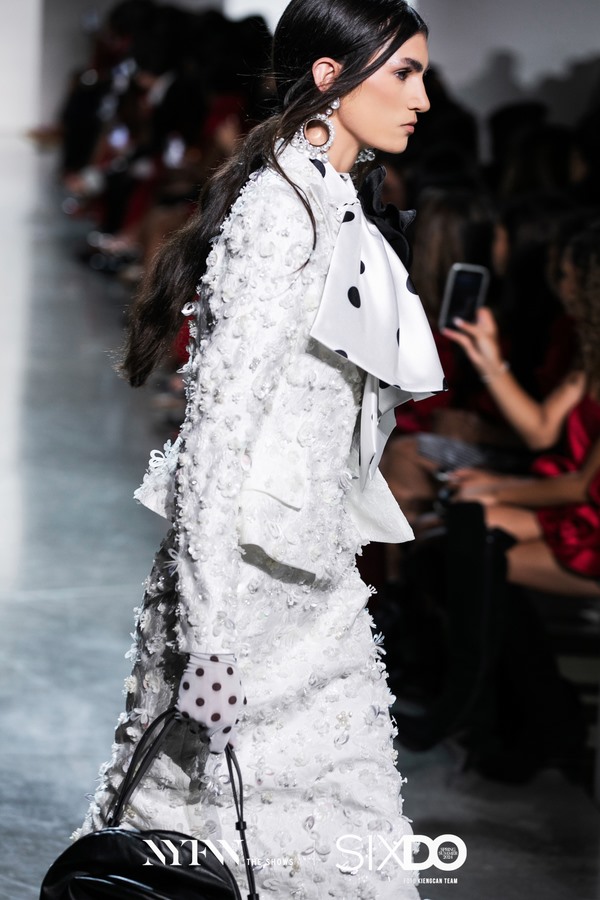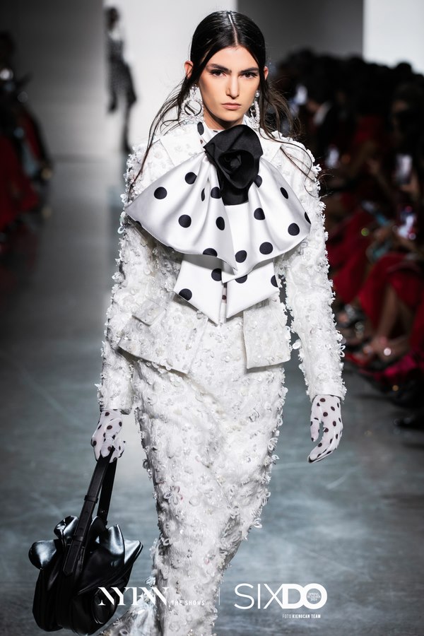 Thiết kế mang phong cách cổ điển, thanh lịch phối áo vest và chân váy bút chì, màu trắng, được tạo điểm nhấn bằng những chi tiết đính kết kỳ công. Trên sàn diễn, người mẫu diện trang phục này với bodysuit chấm bi bên trong, mang túi hoa hồng 3D.