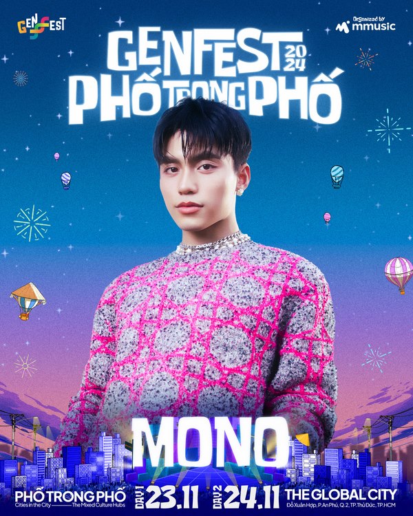 Khởi đầu con đường ca hát vào năm 2022, MONO nhanh chóng tạo nên tiếng vang với phong cách âm nhạc hiện đại, cá tính. Năm 2023, MONO từng đem hàng loạt ca khúc lên sân khấu GENfest, thổi bùng không khí lễ hội với âm nhạc Pop, R&B và Electronic trong Waiting For You, Em Là… Năm 2024, MONO trở lại GENfest và hứa hẹn đem đến những ca khúc mới nhất trong EP ĐẸP như Em Xinh, Đi Tìm Tình Yêu, Chăm Hoa. MONO bày tỏ cùng khán giả: “Đây là lần thứ 2 MONO được đứng trên sân khấu GENfest và được diễn cho mọi người xem, hát cho tất cả cùng nghe 40 – 45 phút lận. Hy vọng MONO sẽ làm tốt nhất có thể để mang lại một không gian âm nhạc cũng như những điều tuyệt vời đến khán giả yêu thương của mình”.