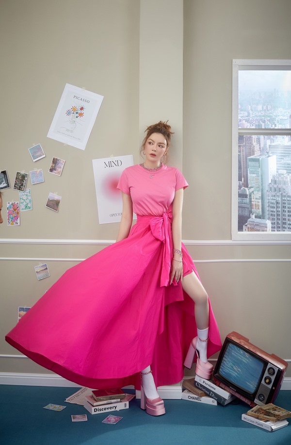Lý Nhã Kỳ cũng có rất nhiều công thức diện đồ mùa hè tươi xinh và nữ tính, điển hình như combo áo thun hồng + váy hồng vạt xéo. Gam màu hồng với sắc độ khác nhau giúp nữ doanh nhân tô đậm nét trong trẻo, yểu điệu thục nữ. Nữ diễn viên còn cho thấy sự khéo léo khi chọn phụ kiện trẻ trung phong cách GenZ, túi xách trắng của Gucci. Các món đồ này “ăn nhập” với tổng thể trang phục, đảm bảo cho người diện vẻ ngoài hài hòa, tinh tế. Nữ diễn viên còn thể hiện sự khéo léo khi áp dụng kiểu tóc đánh rối, giúp nhân đôi vẻ nữ tính cho diện mạo.