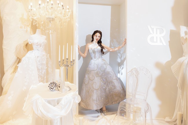 Như tại show của Chung Thanh Phong, Lý Nhã Kỳ không chỉ đơn thuần là một khách mời. Cô hóa thân thành nàng thơ, khoe trọn vẻ đẹp lộng lẫy trong bộ đầm corset ôm sát, chân váy xòe chữ A, được làm từ chất liệu vải ép đá màu ánh bạc độc quyền. Sự lấp lánh như pha lê khi chuyển động, cùng kỹ thuật thêu đính thủ công tinh xảo, đã biến bộ trang phục thành một tác phẩm nghệ thuật, và Lý Nhã Kỳ chính là “người truyền tải” hoàn hảo nhất.
