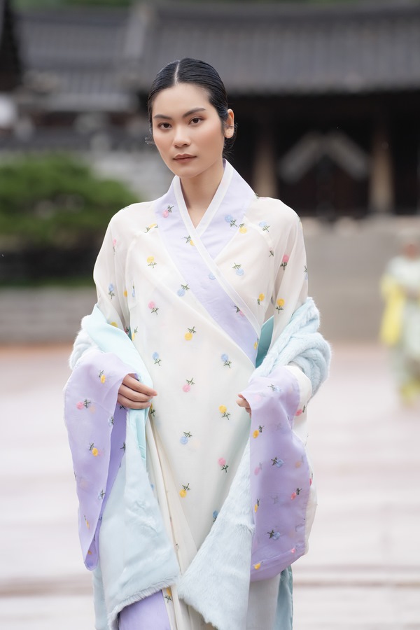BST ‘Duyên’ được NTK Adrian Anh Tuấn lấy cảm hứng từ mùa đông, mùa lễ hội với kiểu dáng đa dạng mang xu hướng thời trang bền vững hoà cùng sắc tím – tone màu chủ đạo của tình yêu, mang lại cho người mặc, người xem những cảm xúc thăng hoa.