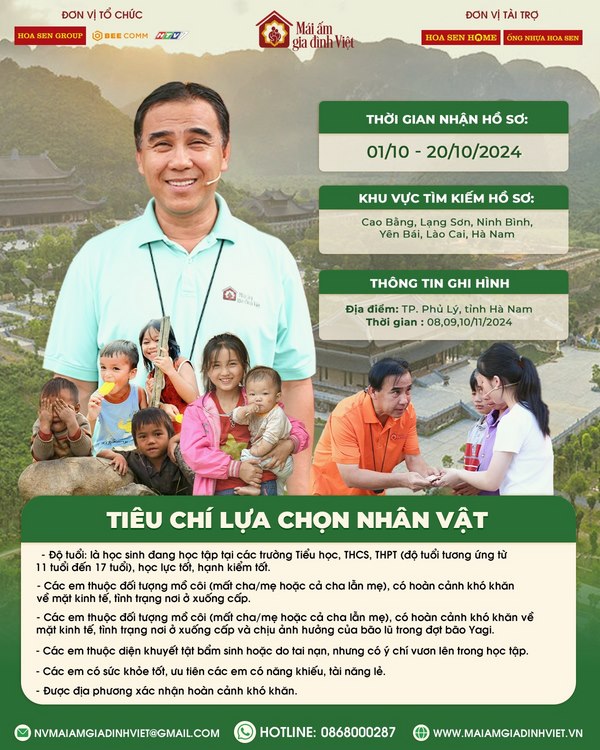 Chương trình Mái Ấm Gia Đình Việt với sự dẫn dắt của MC Quyền Linh lần thứ 3 có mặt tại Bắc Bộ để tìm kiếm, hỗ trợ các em nhỏ mồ côi có hoàn cảnh khó khăn hoặc mồ côi do ảnh hưởng của đợt bão lũ Yagi vừa qua.