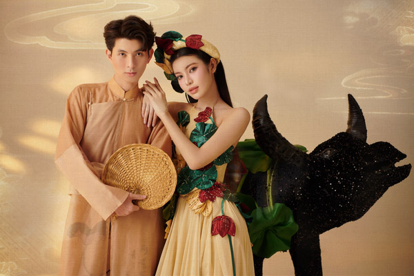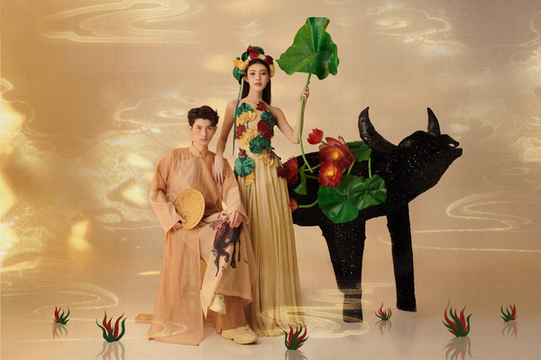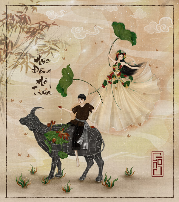 “Mục đồng mơ trưa” là thiết kế có sự biến đổi đầy ngoạn mục từ hình ảnh cậu bé chăn trâu với trang phục bà ba, khăn rằn cùng chú trâu được mô phỏng từ khung tre, lồng đèn trở thành một nàng tú nữ xinh đẹp, lộng lẫy trong chiếc váy yếm tone vàng. Từ câu chuyện “Chăn trâu thổi sáo” của dòng tranh Đông Hồ, Nguyễn Minh Công đã thổi vào đó cái hồn của thời trang đương đại pha lẫn truyền thống để hiện thực hóa giấc mơ của cậu bé chăn trâu năm nào. Dùng kỹ thuật đính 3D, Nguyễn Minh Công đã khéo léo thực hiện một tác phẩm “hai trong một” hài hòa, tinh tế và mang đậm dấu ấn thiết kế của NTK Công chúa.