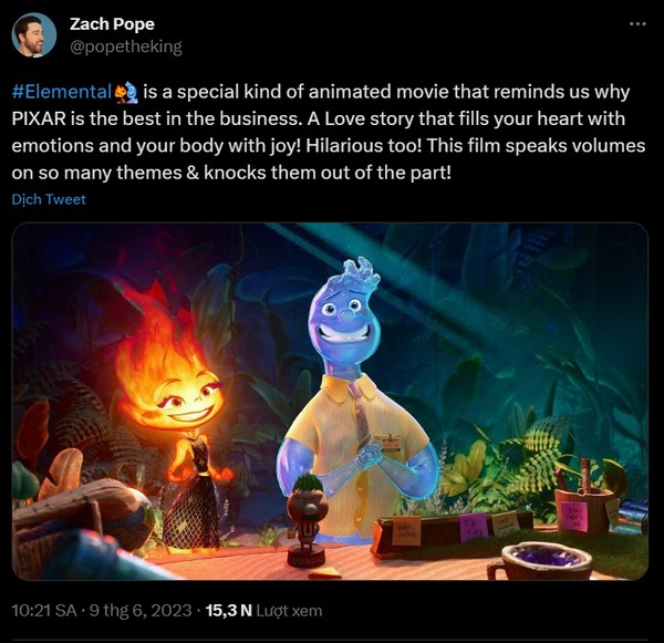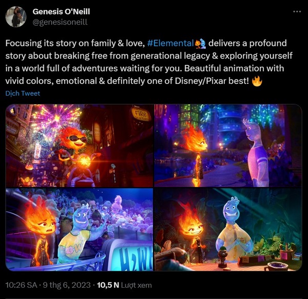 Zach Pope bình luận: “Elemental là kiểu phim hoạt hình độc đáo khi nhắc nhở chúng ta lý do Pixar là nhà sản xuất xịn sò nhất. Một câu chuyện tình yêu sẽ lấp đầy trái tim bạn với cảm xúc và cơ thể bạn với niềm vui! Hài hước nữa! Bộ phim này nói đến rất nhiều chủ đề và khiến chúng thoát khỏi khuôn mẫu”.