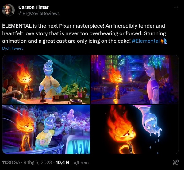 Carson Timar nhận xét: “Elemental là kiệt tác tiếp theo của Pixar! Một câu chuyện tình yêu vô cùng dịu dàng và chân thành, không bao giờ quá lố hay gượng ép. Hình ảnh tuyệt đẹp và dàn diễn viên tuyệt vời chỉ là điểm nhấn trên tổng thể tác phẩm xuất sắc”.