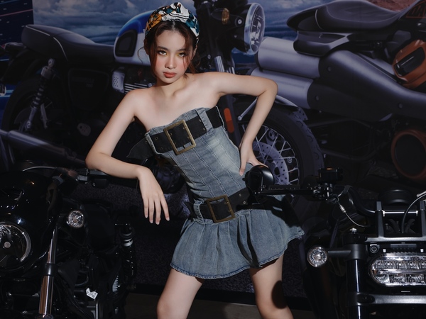 Với thiết kế đầu tiên, Bảo Hà khoác lên mình full set denim với áo cúp ngực cùng chân váy mini-skirt. Khoe khéo bờ vai thon cùng đôi chân dài thẳng tắp, Bảo Hà cũng xử lý được khó khăn trong việc áp dụng chất liệu denim vào một mùa xuân hè khi lựa chọn thiết kế tối giản. Đơn giản nhưng không đơn điệu khi mẫu nhí 1m68 dùng các phụ kiện như thắt lưng, băng đô để làm nổi bật lên trang phục của mình. Hầm hố, bụi bặm nhưng vẫn xinh đẹp, quyến rũ và độc đáo, Bảo Hà trong shoot ảnh này khiến khán giả không khỏi trầm trồ trước nhan sắc nở rộ ở độ tuổi 14.