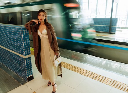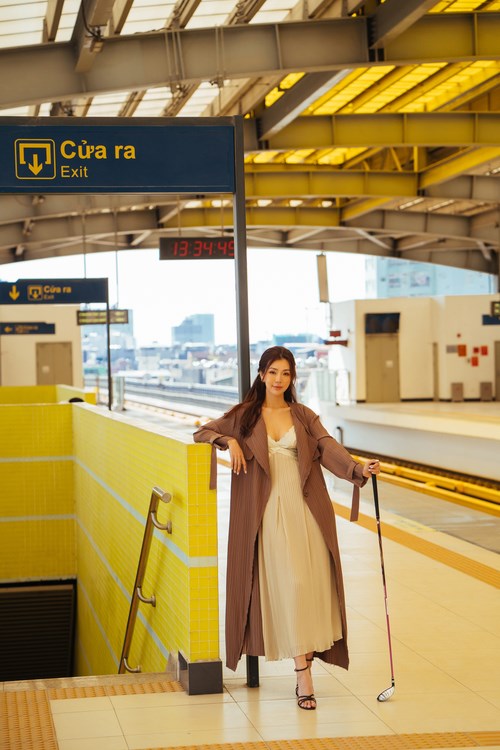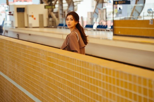 Luôn biết cách lựa chọn hình ảnh xuất hiện phù hợp, Hải Anh khéo léo chọn cho mình bộ trang phục vừa phải, phù hợp với tone màu của ga tàu hiện đại. Điểm xuyến cho tổng thể outfit lần này là chiếc túi xách màu trắng đến từ thương hiệu Bvlgari. Sự kết hợp tinh tế đã tạo ra bộ ảnh trung tính, nhã nhặn, có sức hút mãnh liệt.