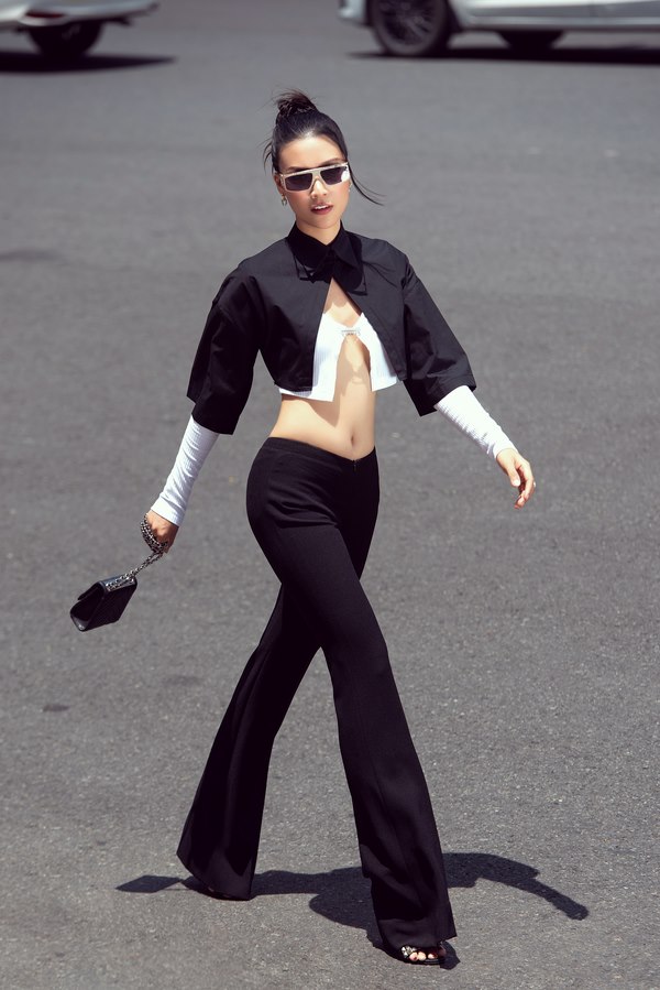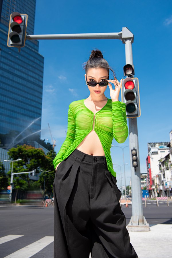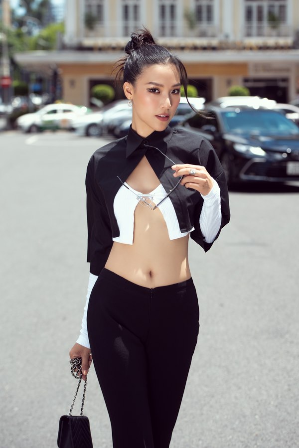 Á hậu Hoàng Oanh mặc áo crop-top xanh neon theo xu hướng Y2K đang thịnh hành hiện nay và phối quần baggy đen. Người đẹp dùng chiếc kính đen hoàn thiện phong cách của mình, đúng chuẩn một người phụ nữ hiện đại, phóng khoáng. Trong bộ cánh khác, cô diện mốt áo len “nguy hiểm” chỉ gài hờ hững khoe trọn eo thon. Áo khoác đen đồng điệu với túi và quần giúp Hoàng Oanh càng trở nên nổi bật. Ngoài ra, cô tinh tế sử dụng màu trắng trong bộ ảnh của mình. Mỹ nhân khoác trên mình chiếc áo trắng phá cách với các dây đan lưới rũ xuống tận chân. Còn khi kết hợp quần jeans, nữ MC mặc crop-top cổ yếm khoe vai trần quyến rũ.